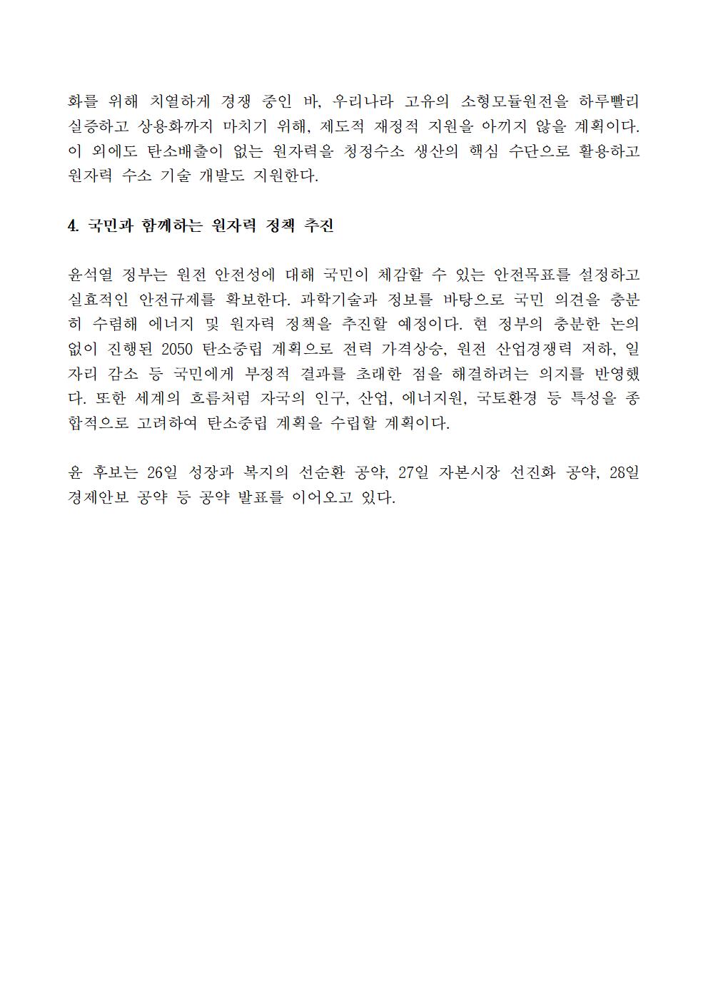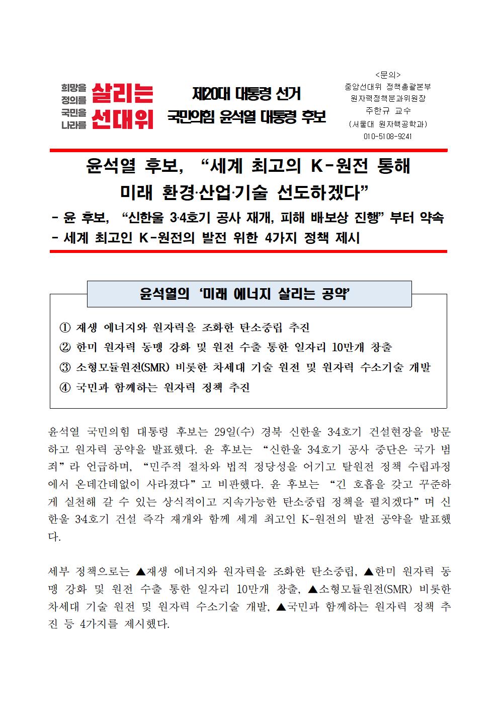 [보도자료] 윤석열 후보, “세계 최고의 K-원전 통해 미래 환경·산업·기술 선도하겠다”
