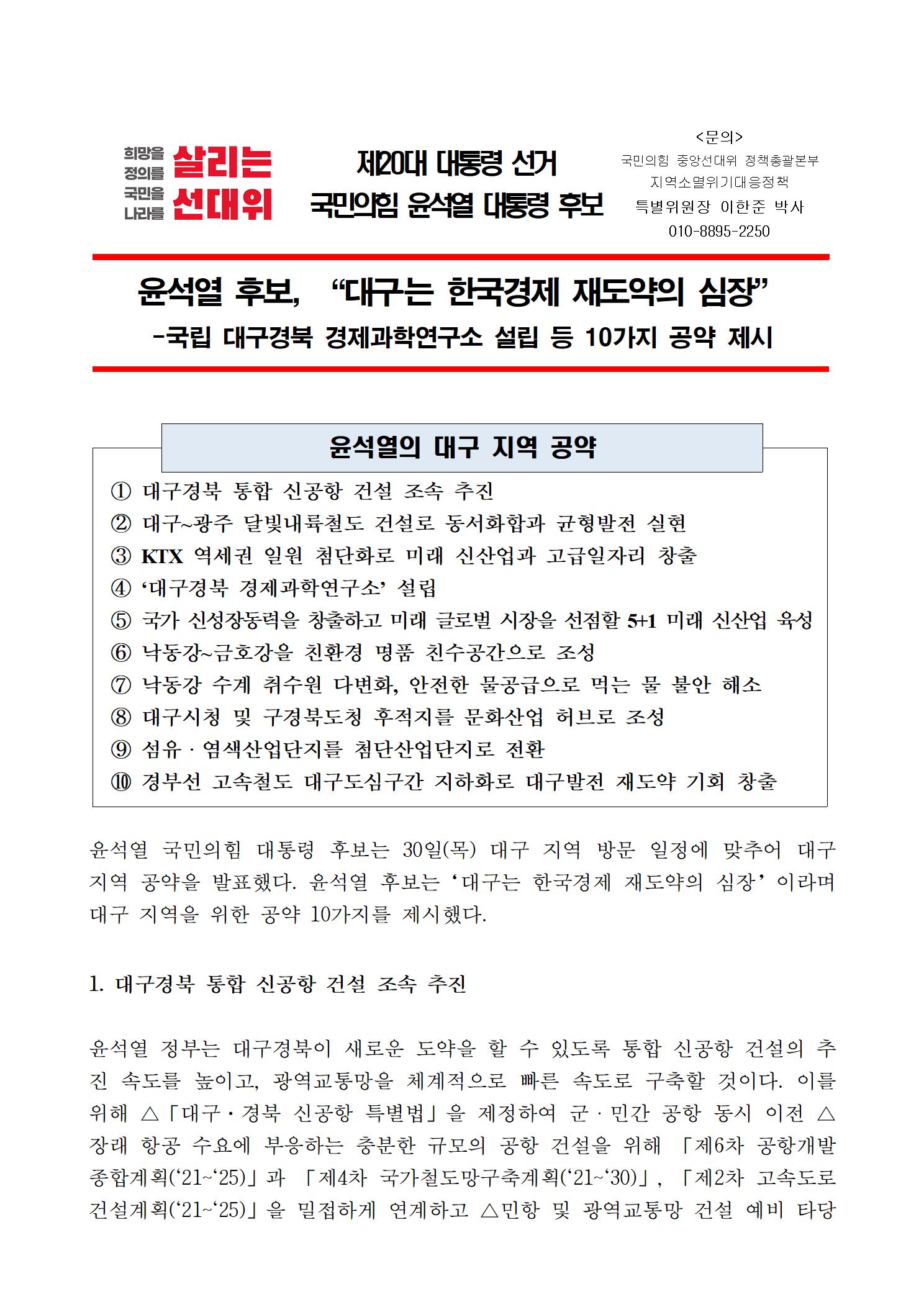 [보도자료] 윤석열 후보, “대구는 한국경제 재도약의 심장” -국립 대구경북 경제과학연구소 설립 등 10가지 공약 제시