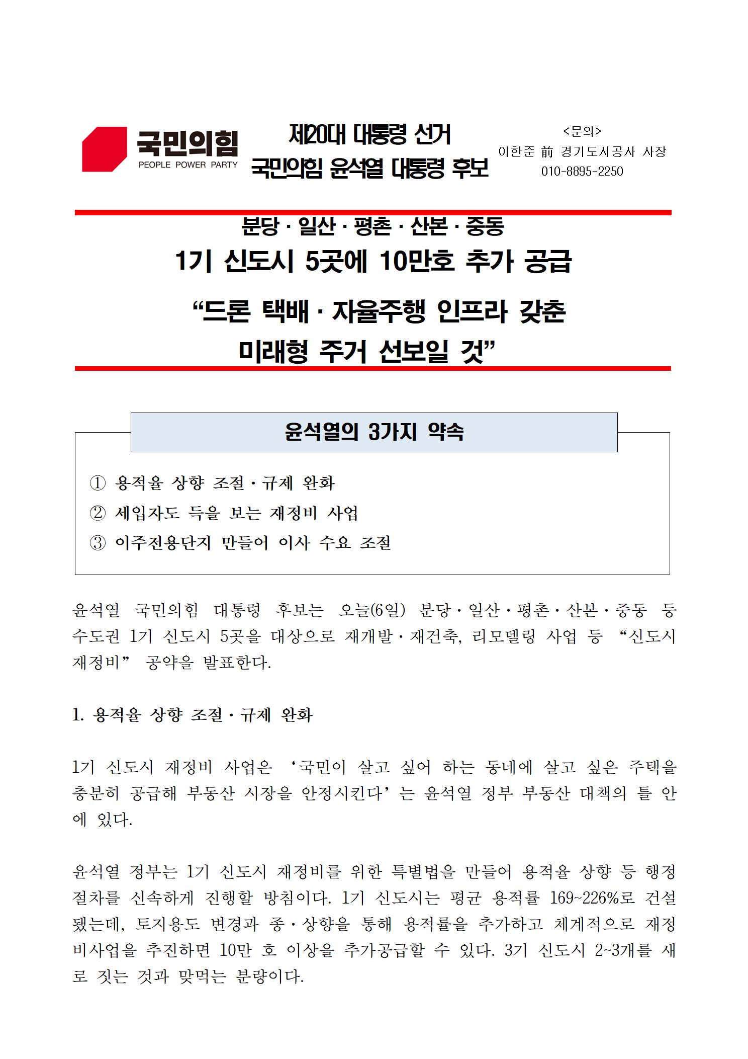 [보도자료] 신도시 재정비 공약 -분당·일산·평촌·산본·중동 1기 신도시 5곳에 10만호 추가 공급