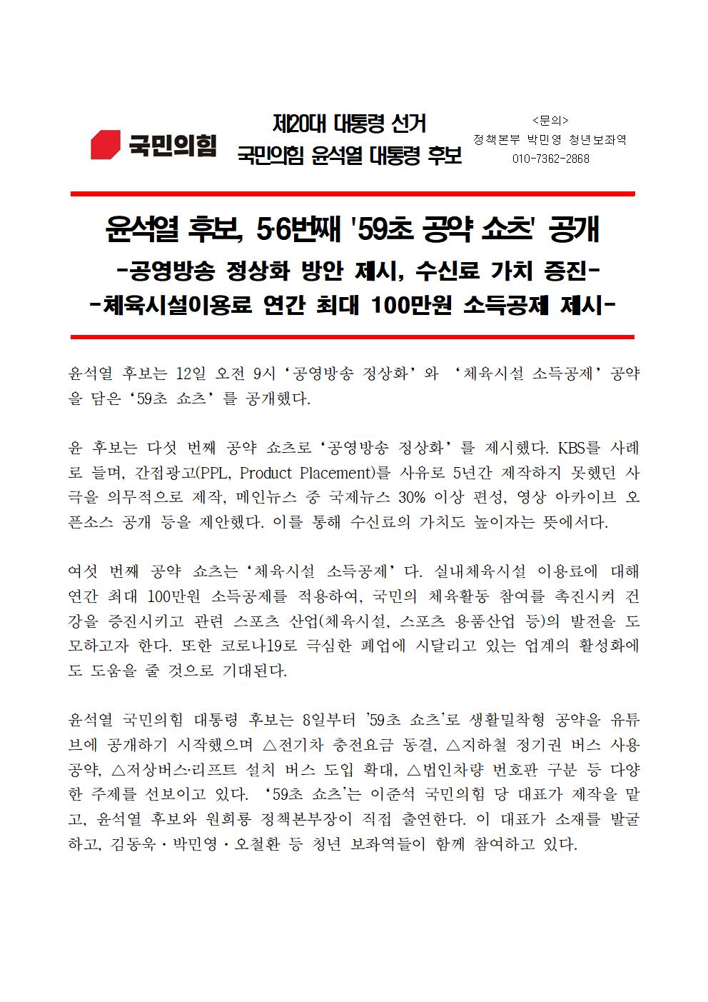 [보도자료] 윤석열 후보, 5·6번째 '59초 쇼츠' 공약 공개