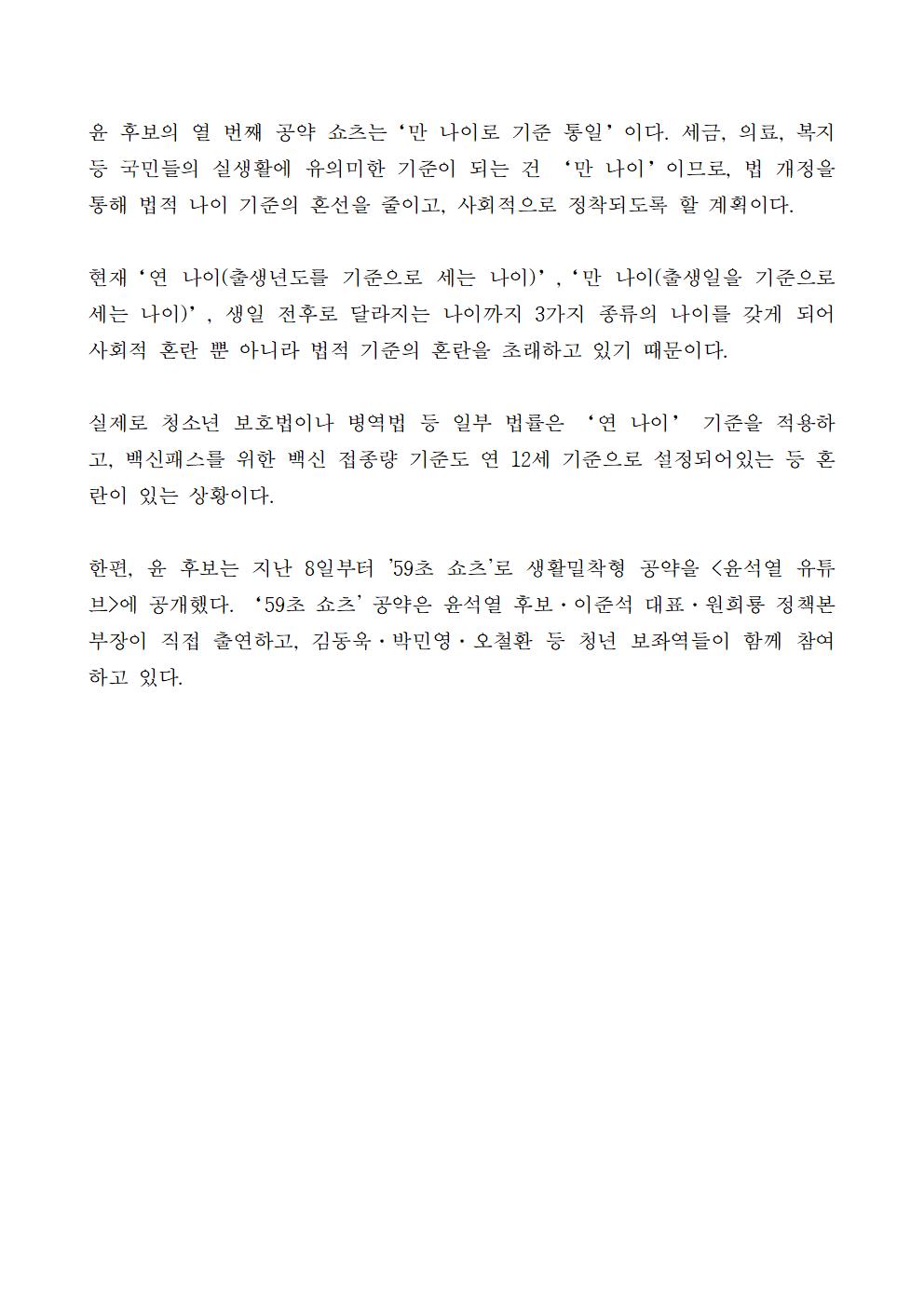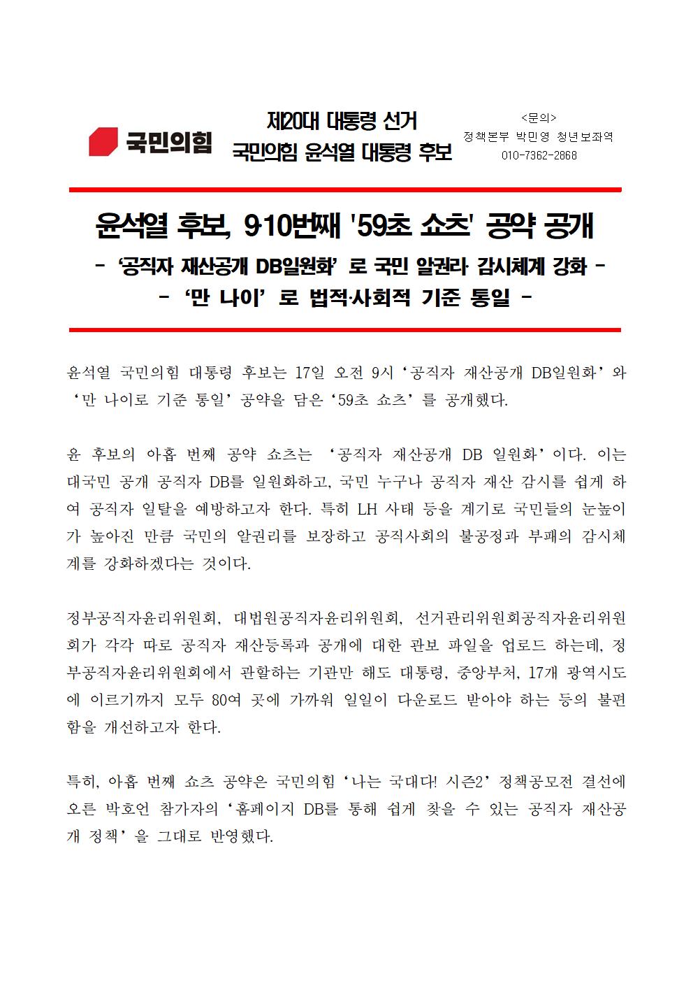[보도자료] 윤석열 후보, 9·10번째 '59초 쇼츠' 공약 공개