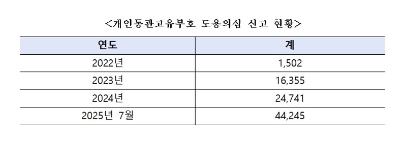 2022년 10월 관세청 홈페이지에 도용신고 전용 창구가 신설된 후 2022년에는 1502건이 접수됐으며, 2023년 1만 6355건, 2024년 2만 4741건에 이어 올해는 7월까지 4만 4245건으로 매년 급증하고 있는 실정이다.